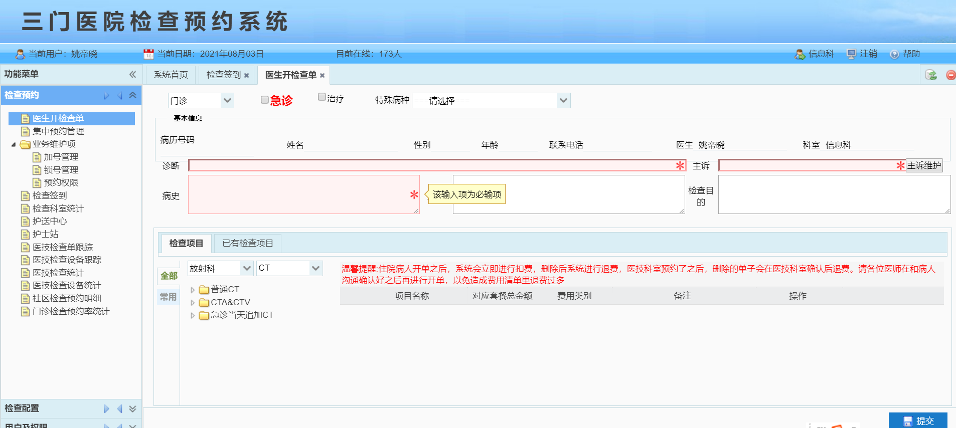 檢查預約系統實現檢查功能的排班、資源預約、患者預約時智能識別關鍵部位的互斥,為患者提供一站式服務中心,實現醫院檢查業務的患者“最多跑一次功能”。